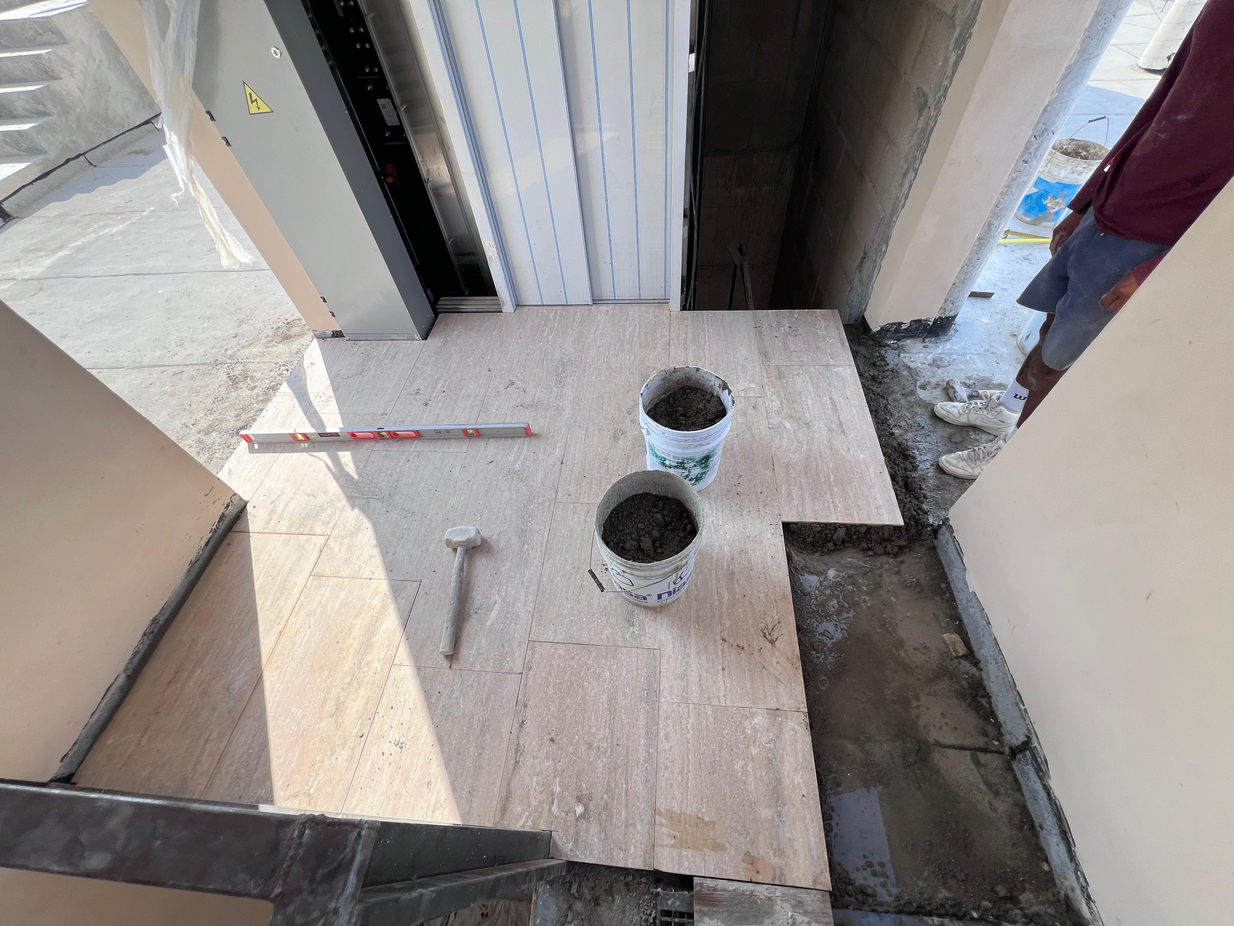- Acabados: Terminamos de colocar el mármol en los baños y balcones faltantes, y continuamos con la colocación en pasillos. La pasta está terminada en las fachadas frontal y trasera. Los tablaroqueros se encuentran trabajando en el tercer y último nivel.