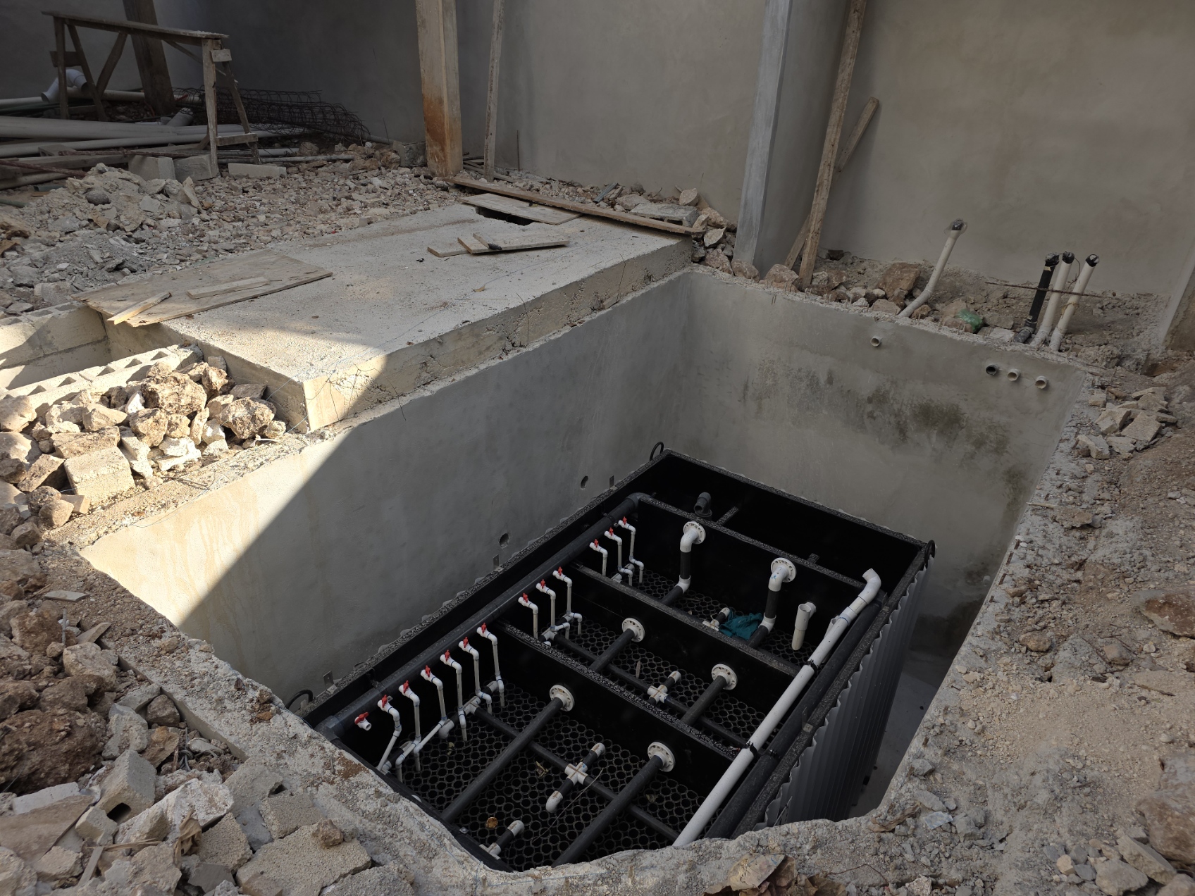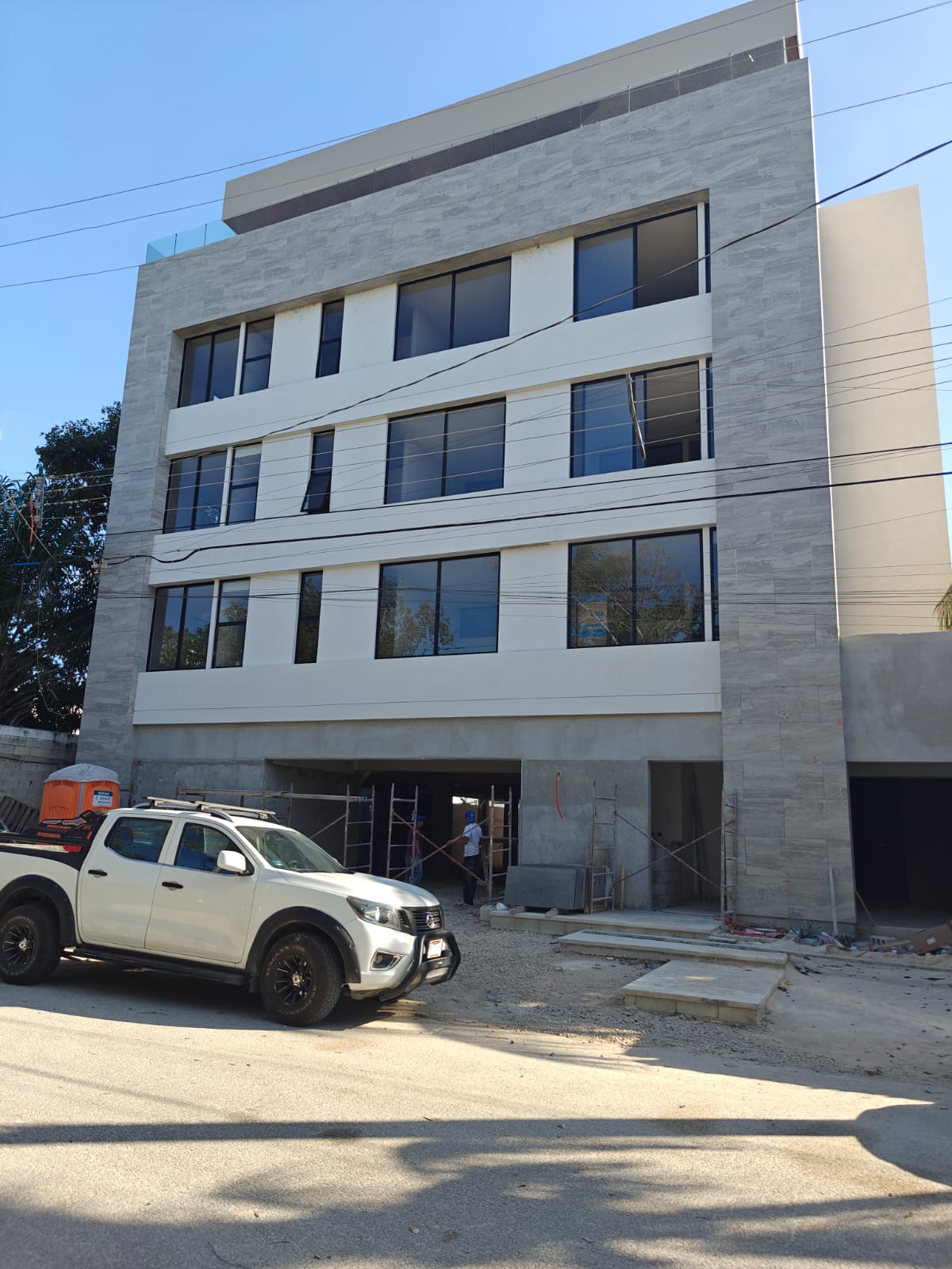 - Equipamiento y Sistemas: El sistema PTAR (Planta de Tratamiento de Aguas Residuales) ya se encuentra en las instalaciones. Asimismo, la cancelería del último nivel ya está en el edificio lista para su colocación, y se están realizando los ajustes técnicos necesarios para la próxima llegada del elevador.