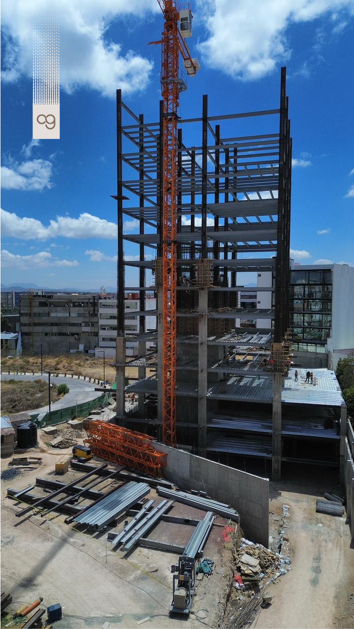 - Niveles superiores y núcleos: Se ejecuta el habilitado de acero y cimbrado de columnas en el segundo y tercer nivel. De igual forma, se ejecutó el colado en el núcleo de elevadores y escaleras del segundo nivel, y se continúa con el habilitado y cimbrado del tercer nivel.