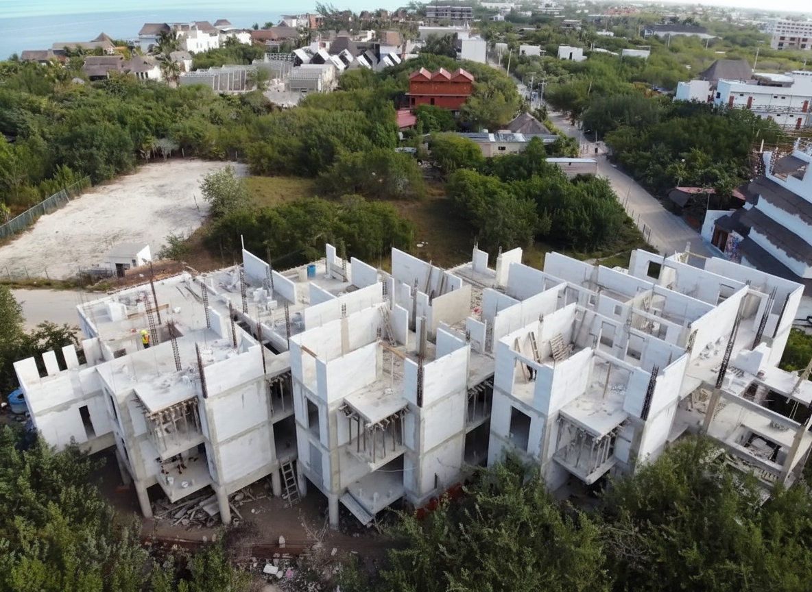 Construcción y comercialización de 21 departamentos distribuidos en 4 niveles en Holbox, Quintana Roo. Tendrá rooftop, alberca, bar, fogateros, asadores y acceso controlado.