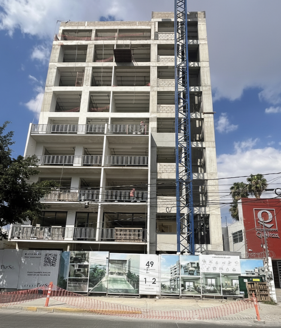 Edificio de 49 departamentos con 9 niveles en Guadalajara. Contará con tres sótanos para estacionamiento, jardines, terrazas, rooftop, albercas, cowork, bar, acceso controlado, elevadores y gimnasio.